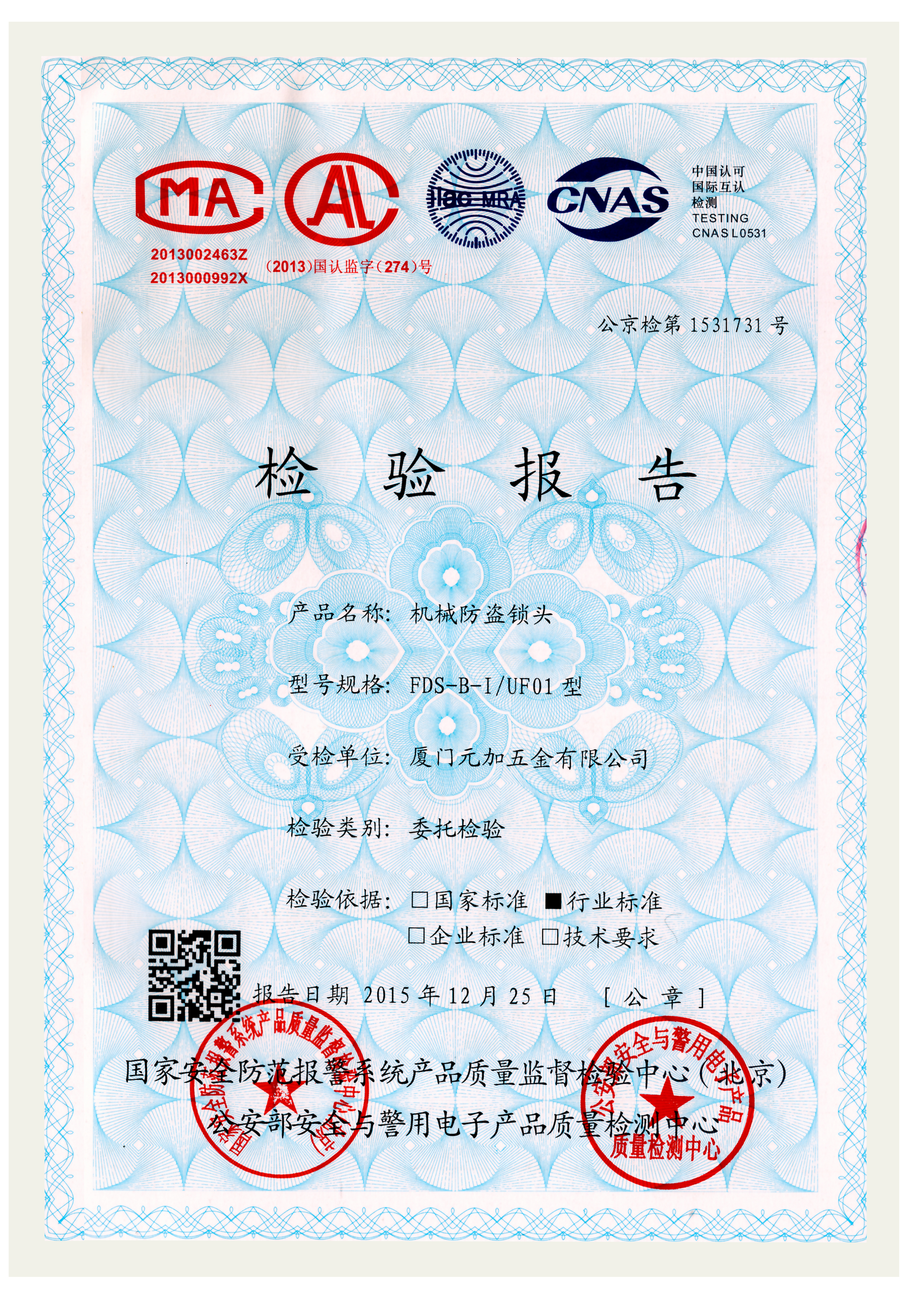 2015年 元嘉五金 超B级机械防盗锁芯 UF01 经国家权威机构检测为合格产品