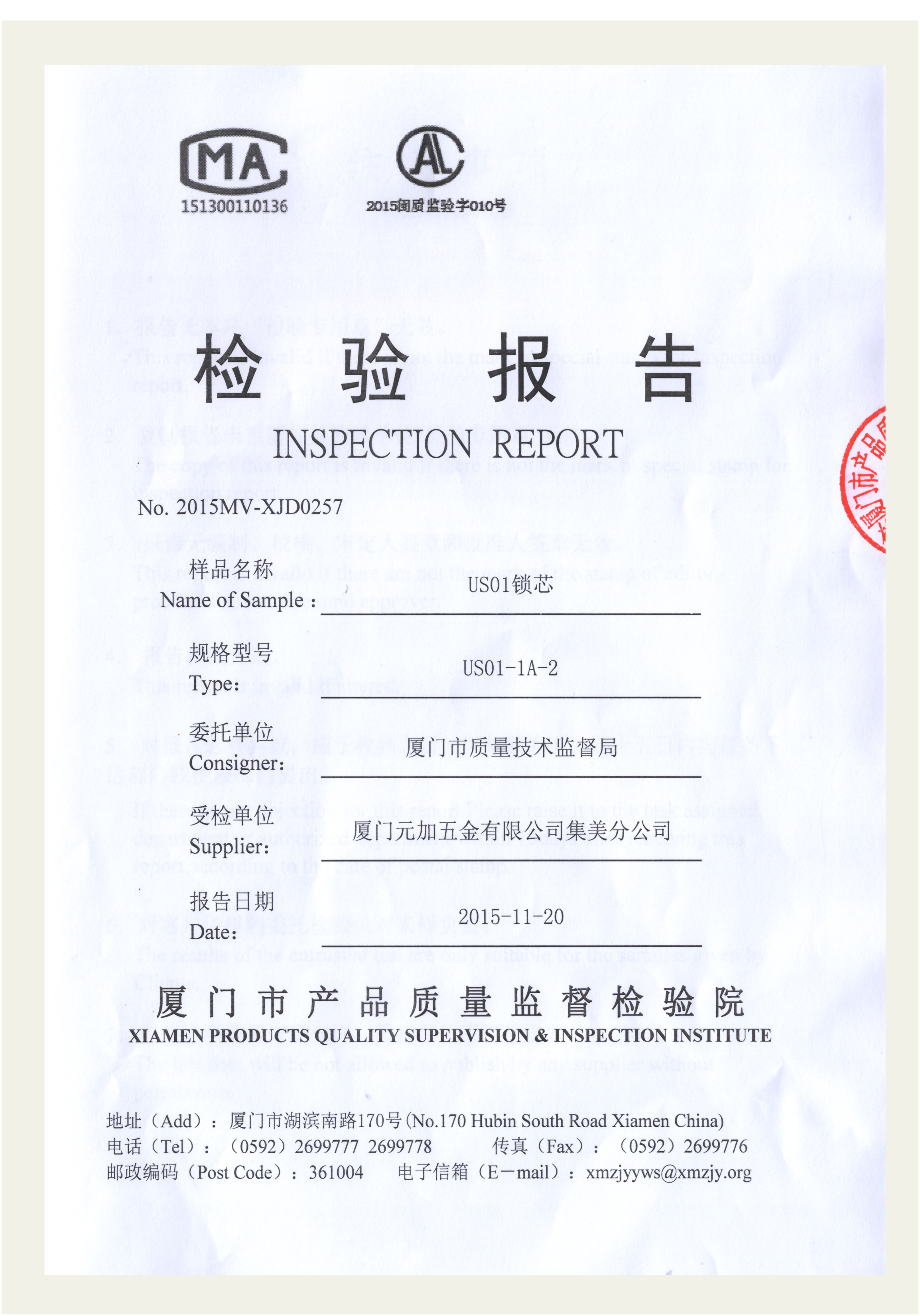 2015年 元嘉五金 锁芯产品经福建省厦门市质量技术监督局抽查检测为合格产品